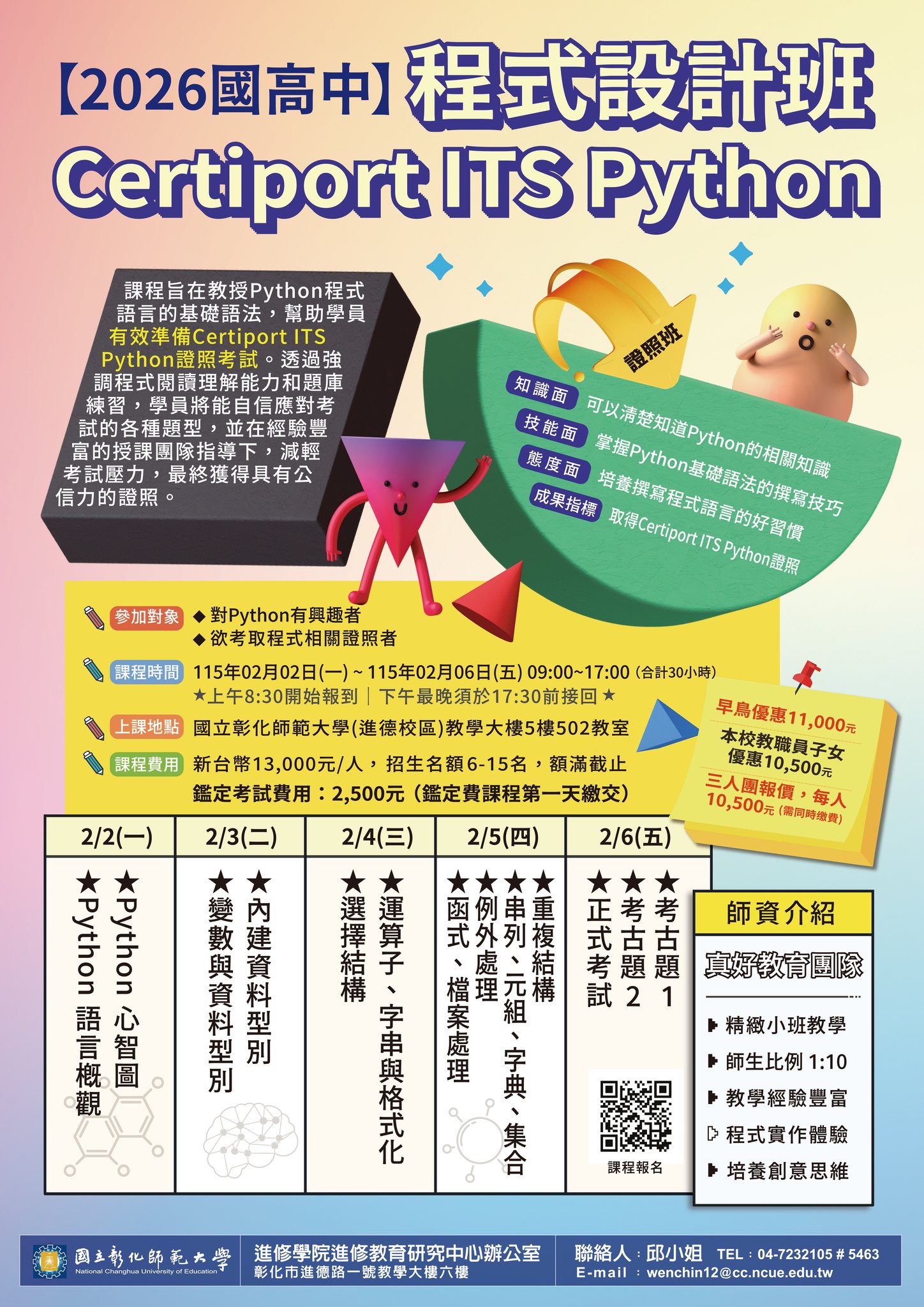 一、「【2026國高中程式語言】Certiport ITS Python程式設計班」