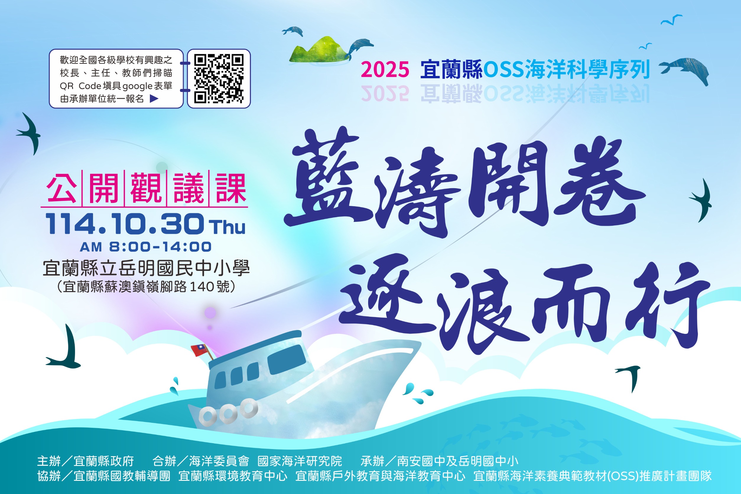 | 公告主旨 | 宜蘭縣政府辦理「2025宜蘭縣OSS海洋科學序列『藍濤開卷,逐浪而行』公開觀議課成果會實施計畫」,歡迎踴躍參加。 |