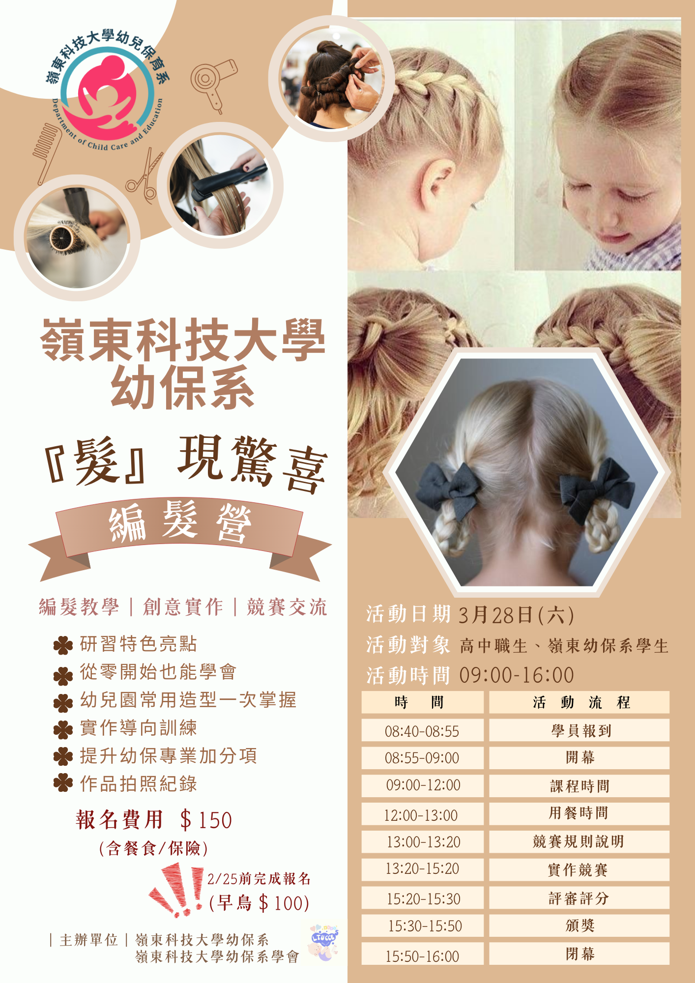 | 公告主旨 | 嶺東科技大學幼兒保育系辦理「髮現驚喜編髮營」活動企劃書,歡迎學生踴躍報名參加。 |