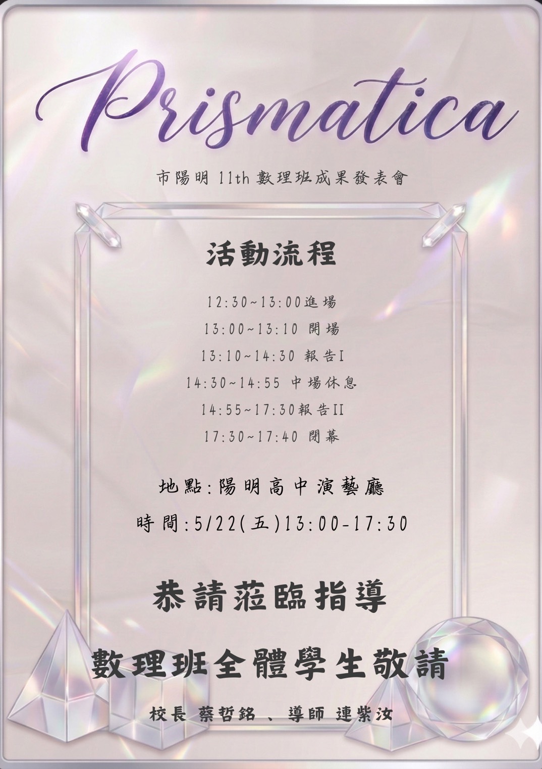 | 公告內容 | 說明: 一、本校第十一屆數理科學班成果發表會主題:Prismatica。 二、時間:115年5月22日(星期五)12:30入場、13:30正式開始。 三、地點:本校活動中心一樓演藝廳。地址:臺北市士林區中正路510號。 四、敬請欲報名單位於115年5月8日(星期五)前至表單完成報名。 |