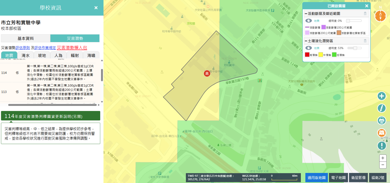 地震災害潛勢圖資 114年地震災害潛勢結果:低 說明:第一棟,第一棟,第二棟,第三棟,100≦Is值或1≦CDR值;各類活動斷層兩側超過200公尺範圍;土壤液化中潛勢;校園位於活動斷層地質敏感區範圍外;過去2年內校園不曾發生地震災害事件。 113年地震災害潛勢結果:低 說明:第一棟,第一棟,第二棟,第三棟,100≦Is值或1≦CDR值;各類活動斷層兩側超過200公尺範圍;土壤液化中潛勢;校園位於活動斷層地質敏感區範圍外;過去2年內校園不曾發生地震災害事件。